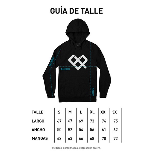 Pre lavado (Revisar tabla de talles) . Estampa a un color en frente y espalda. Tinta con base soft. Frisa esmerilada, gamuzada y abierta. 50% algodón 50% poliéster. Capucha con cordón de ajuste. Bolsillo canguro. Etiqueta tejida de marca.