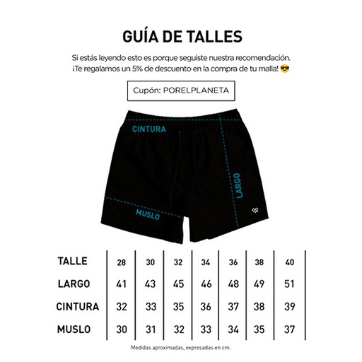 ◦ Malla con cintura elástica y cordón de ajuste. ◦ Microfibra lisa con protección UV +50 y secado rápido. ◦ Composición 96% Poliéster 4% Elástano. ◦ Producto nacional.