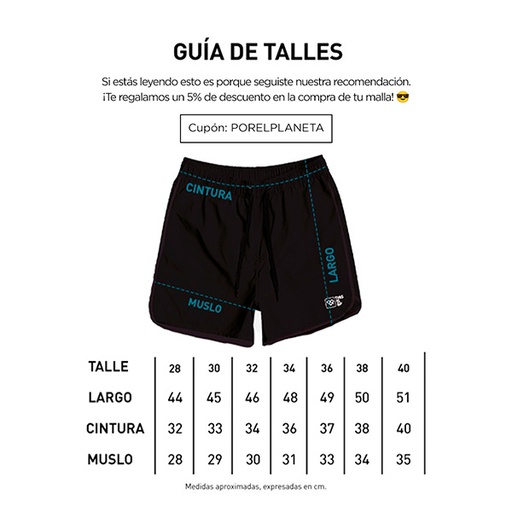◦ Malla con cintura elástica y cordón de ajuste con puntera termocontraible. Confeccionada en Microfibra 4 Way lisa con protección UV+50 y secado rápido, aumentando la eficiencia en el agua y durabilidad de la prenda. Estampa en delantero a un color. ◦ Bolsillo trasero con cierre. ◦ Fit 17". ◦ Composición: 96% Poliéster 4% Elastano. ◦ Producto nacional.