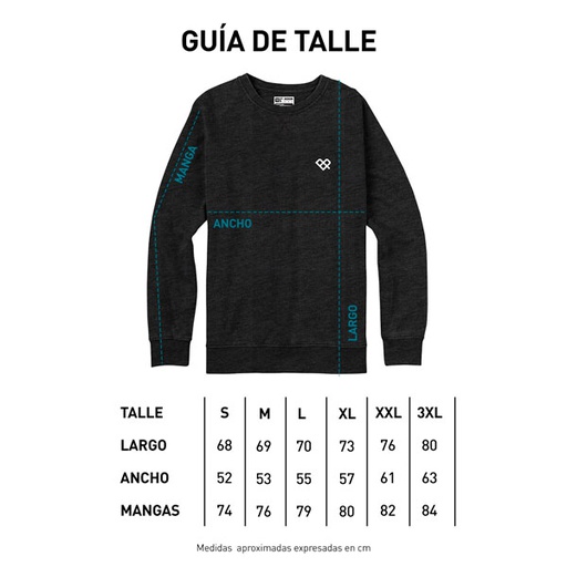 ◦ Buzo cuello redondo de frisa esmerilada y gamuzada. Tacto suave. ◦ Estampa a 1 color en frente. Tinta con base soft. ◦ Cuello, puños y cintura de ribb complemento. ◦ Etiquetas de marca tejidas. ◦ Composición: 50% Poliéster 50% Algodón. ◦ Fit regular. ◦ Producto nacional.